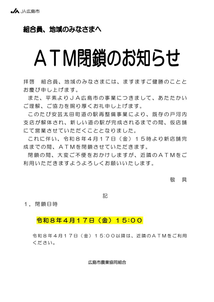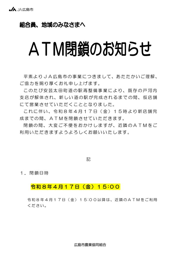 ATM閉鎖のお知らせ(戸河内支店)