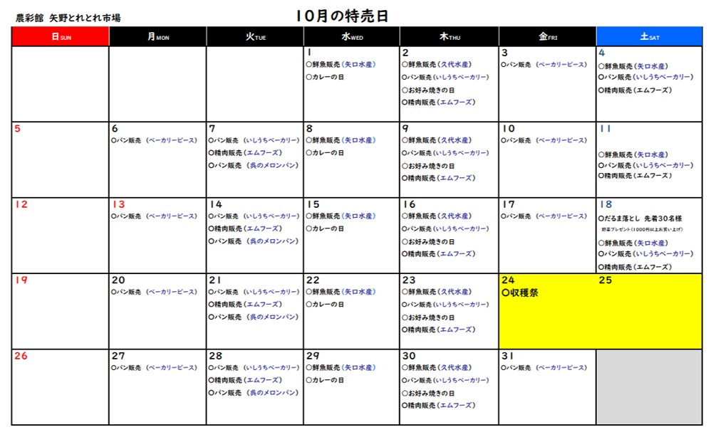 農彩館 矢野 とれとれ市場 10月イベントスケジュール